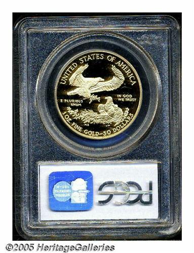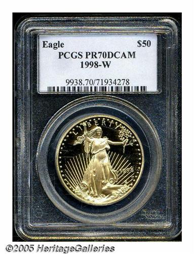 <B>1998-W<G$50> One-Ounce Gold Eagle PR70 Deep Cameo PCGS.</B></I> Stunning, deeply contrasting cameo example. Population: 3 in 70 (6/05).<BR><I>From The William Bickel Collection, Part One.</B></I>