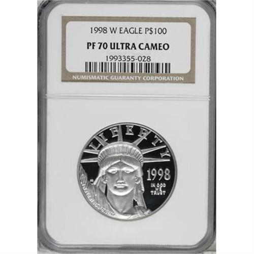 <B>1998-W P$100 One-Ounce Platinum Eagle PR70 Deep Cameo NGC.</B></I> NGC Census: (0/0). PCGS Population (20/0). Mintage: 26,047. Numismedia Wsl. Price for NGC/PCGS coin in PR70: $1,725. (#99768)<BR><BR><b>Shipping:</b> Coins & Currency (<a target="_blank" href="http://www.heritageauctions.com/common/shipping.php">view shipping information</a>)