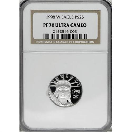 <B>1998-W P$25 Quarter-Ounce Platinum Eagle PR70 Deep Cameo NGC.</B></I> NGC Census: (0/0). PCGS Population (19/0). Mintage: 14,203. Numismedia Wsl. Price for NGC/PCGS coin in PR70: $600. (#99766)<BR><BR><b>Shipping:</b> Coins & Currency (<a target="_blank" href="http://www.heritageauctions.com/common/shipping.php">view shipping information</a>)