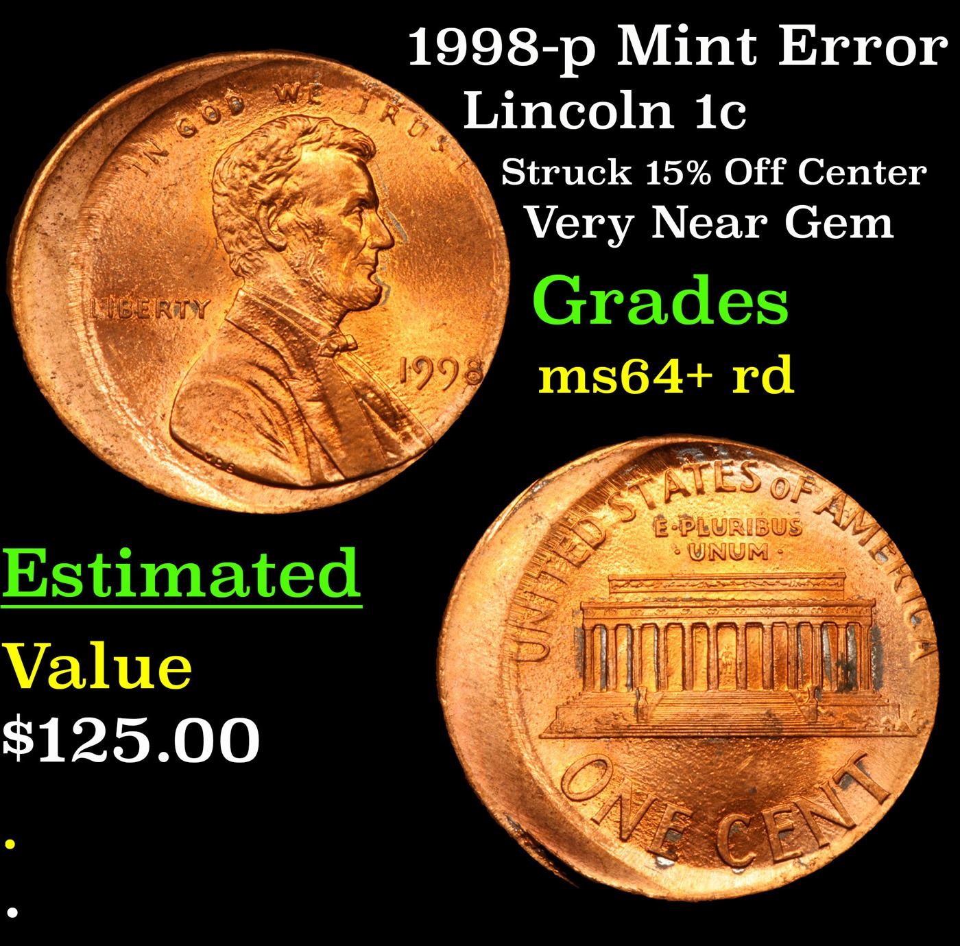 1998-p Mint Error Lincoln Cent 1c Grades Choice+ Unc RD.