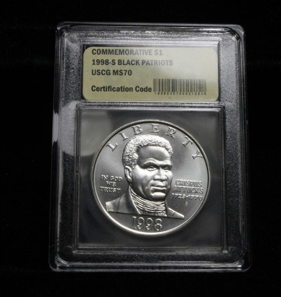 The 1998 Black Revolutionary War Patriots Silver Dollar was issued to mark the 275th anniversary of the birth of Crispus Attucks. He was the first patriot killed during the Boston Massacre in 1770, one of the events leading up to the Revolutionary War. Encapsulated and Graded ms70 by USCG. PCGS lists ms70 as $900. Estimated Value $350
