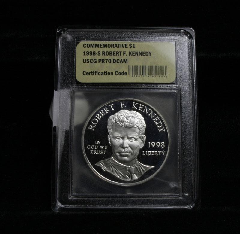 The 1998 Robert F. Kennedy Silver Dollar was issued to commemorate the life and work of Robert F. Kennedy. It was issued on the 30th anniversary of his death. Encapsulated and graded PR70 DCAM by USCG. PCGS lists PR70 DCAM at $1725. Estimated Value $350