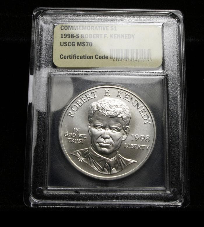 The 1998 Robert F. Kennedy Silver Dollar was issued to commemorate the life and work of Robert F. Kennedy. It was issued on the 30th anniversary of his death. Encapsulated and graded ms70 by USCG. PCGS lists ms70 at $475. Estimated Value $150