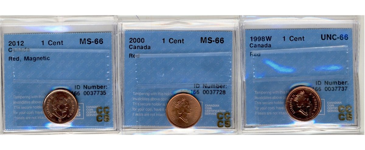 1998W 1 Cent, 2000, 2012 Magn, CCCS MS66RD; Three coins.