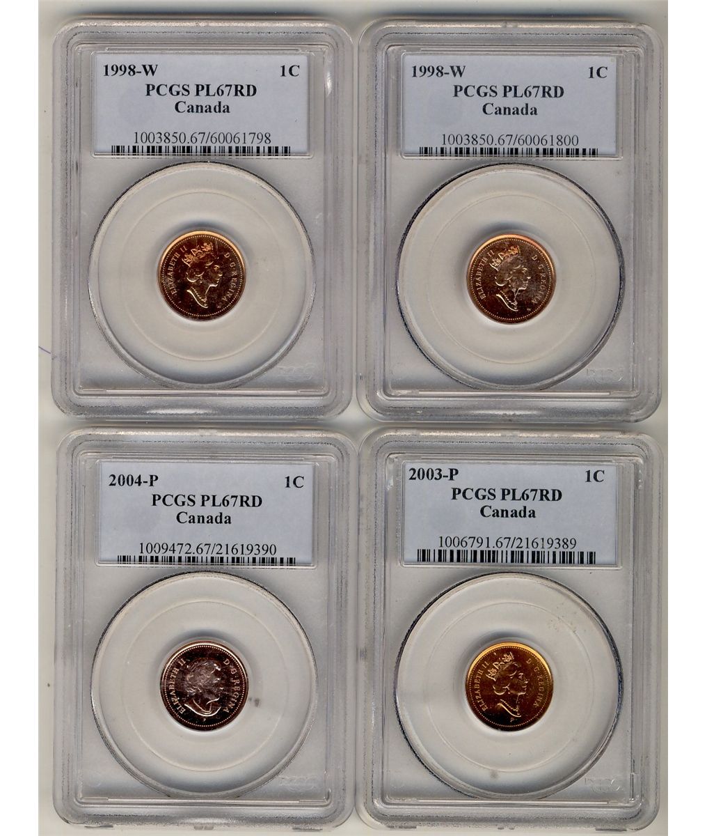 1998W(2) 1¢, 2003P & 2004P PCGS PL67RD. Lot of 4 coins.