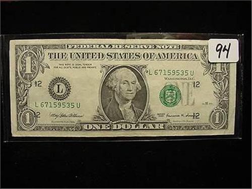 1999 $1.00 Federal Reserve Error W/ Serial Number and Seal Shifted to Left - XF