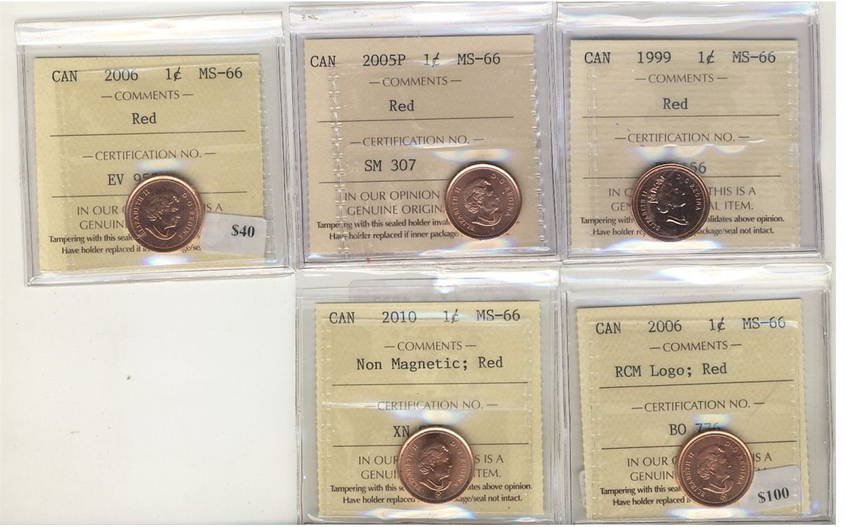 1999 1¢, 2005P, 2006, 2006 Logo & 2010 Non Magn all ICCS MS66RD. Lot of 5 coins.