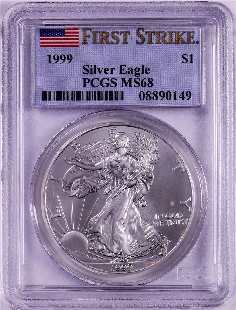 One 1999 $1 American Silver Eagle Coin PCGS MS68 First Strike. PCGS Graded.