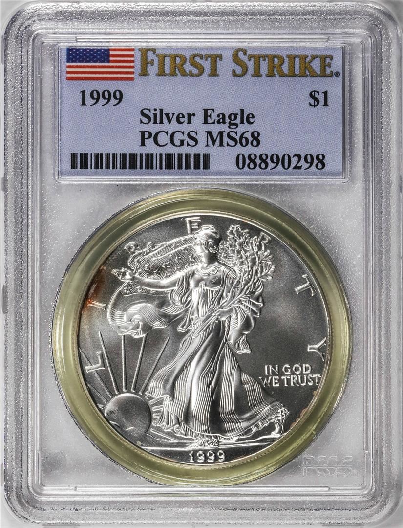 One 1999 $1 American Silver Eagle Coin PCGS MS68 First Strike. PCGS Graded.
