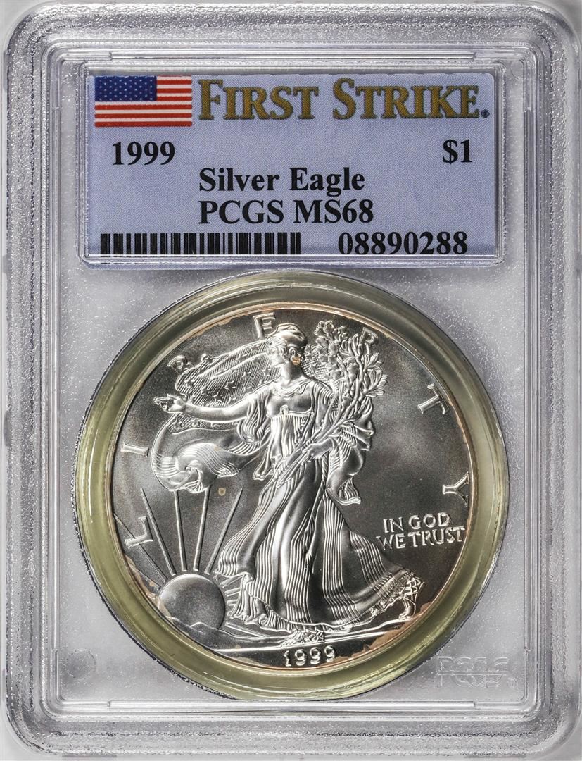 One 1999 $1 American Silver Eagle Coin PCGS MS68 First Strike. PCGS Graded.