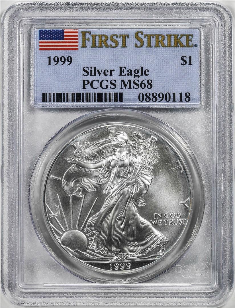 One 1999 $1 American Silver Eagle Coin PCGS MS68 First Strikes. PCGS Graded.