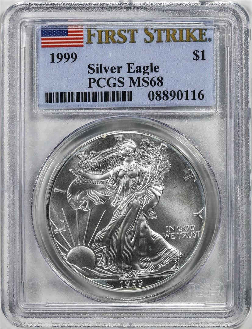One 1999 $1 American Silver Eagle Coin PCGS MS68 First Strikes. PCGS Graded.