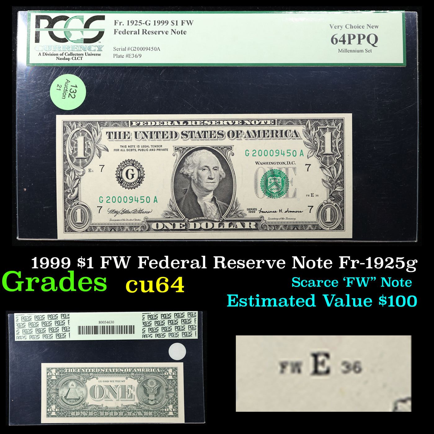 1999 $1 FW Federal Reserve Note Fr-1925g Graded cu64 By PCGS