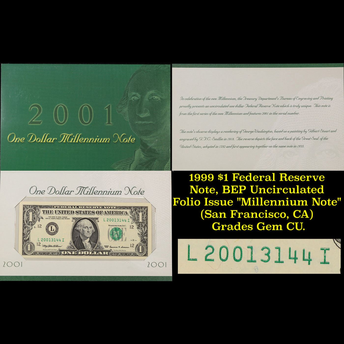 1999 $1 Federal Reserve Note, BEP Uncirculated Folio Issue "Millennium Note" (San Francisco, CA) Grades Gem CU.