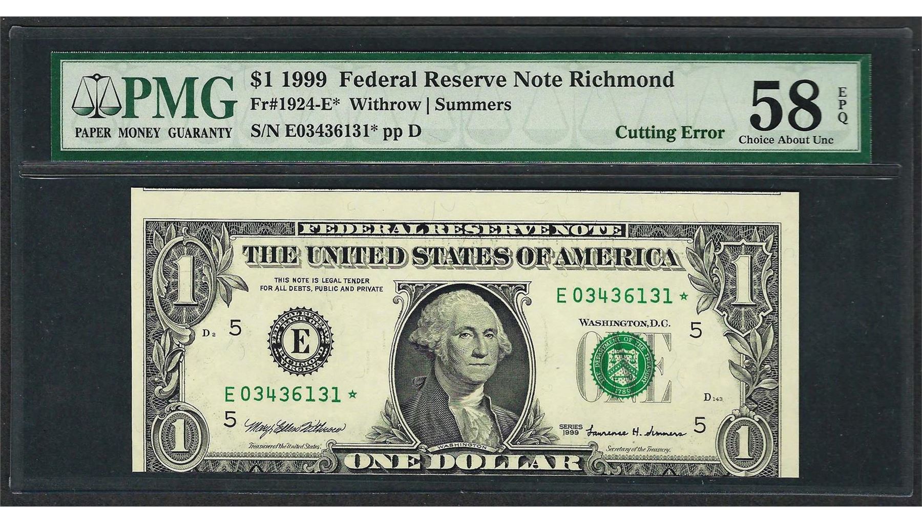 1999 $1 Federal Reserve Note Cutting ERROR PMG Choice About Uncirculated 58EPQ