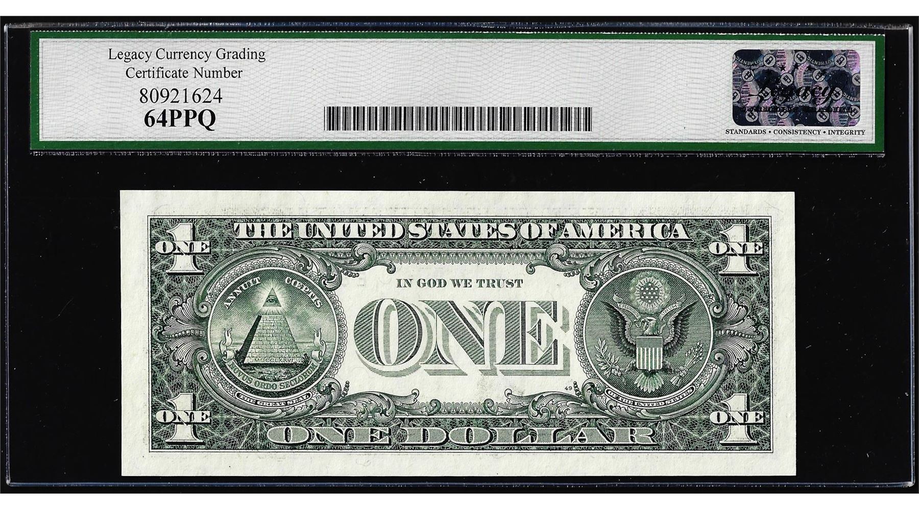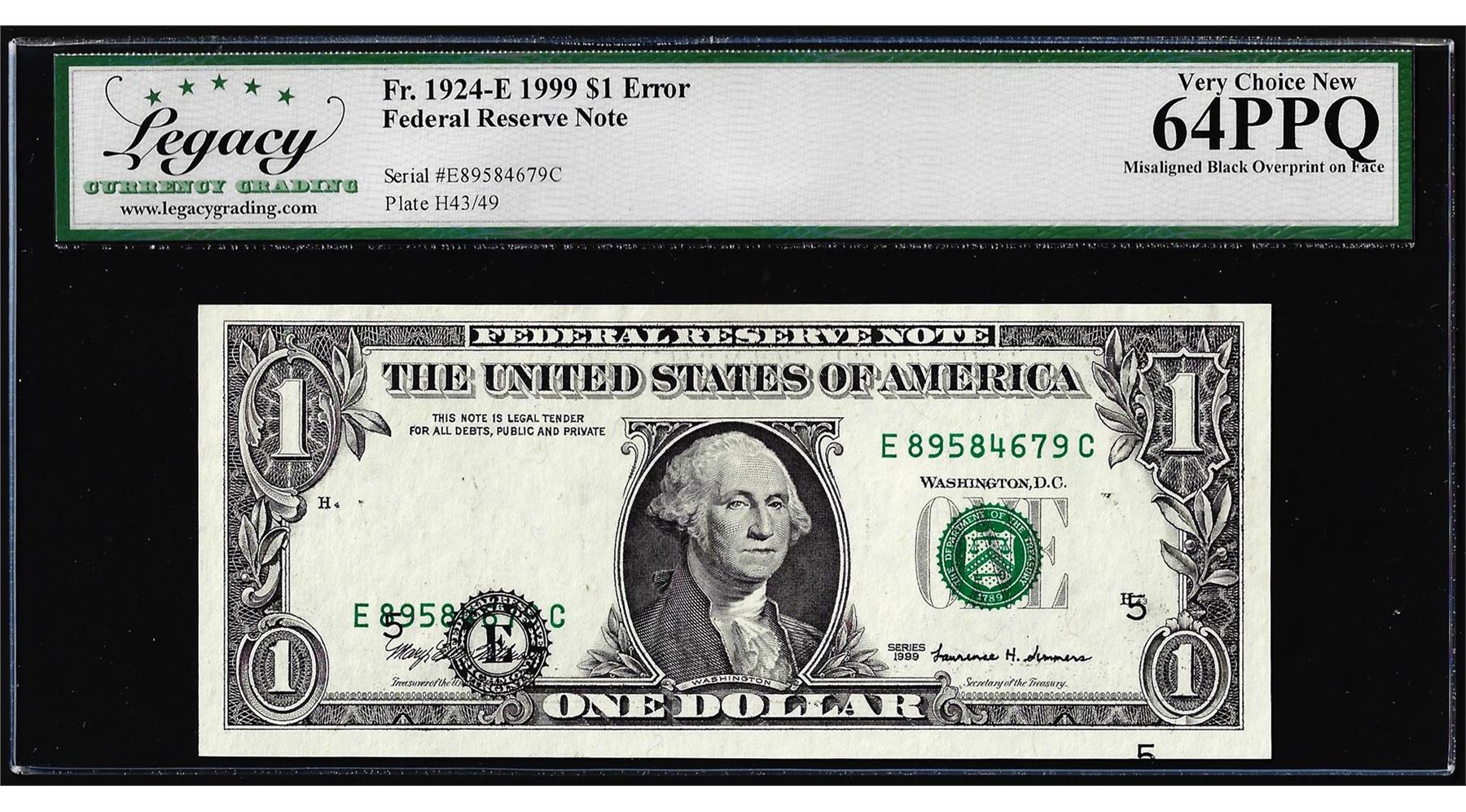 One 1999 $1 Federal Reserve Note Misaligned Overprint Error Legacy Very Choice New 64PPQ. Legacy Graded.