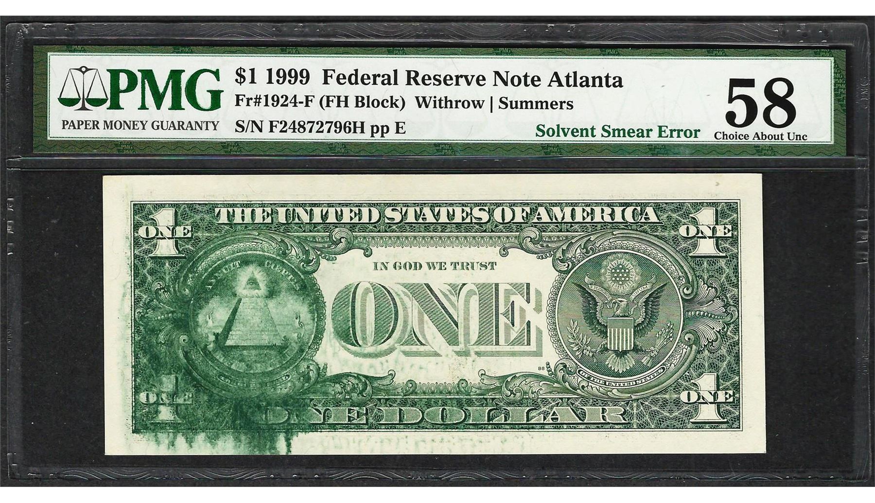 One 1999 $1 Federal Reserve Note Solvent Smear ERROR PMG About Uncirculated 58. PMG Certified.