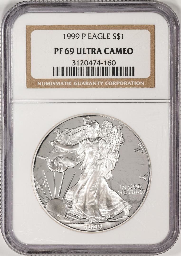 One 1999 $1 Proof American Silver Eagle Coin NGC PF69 Ultra Cameo. NGC Certified.