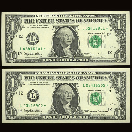 Scarce Choice/Gem uncirculated 1999 L San Francisco $1 STAR Federal Reserve Note consecutive pair