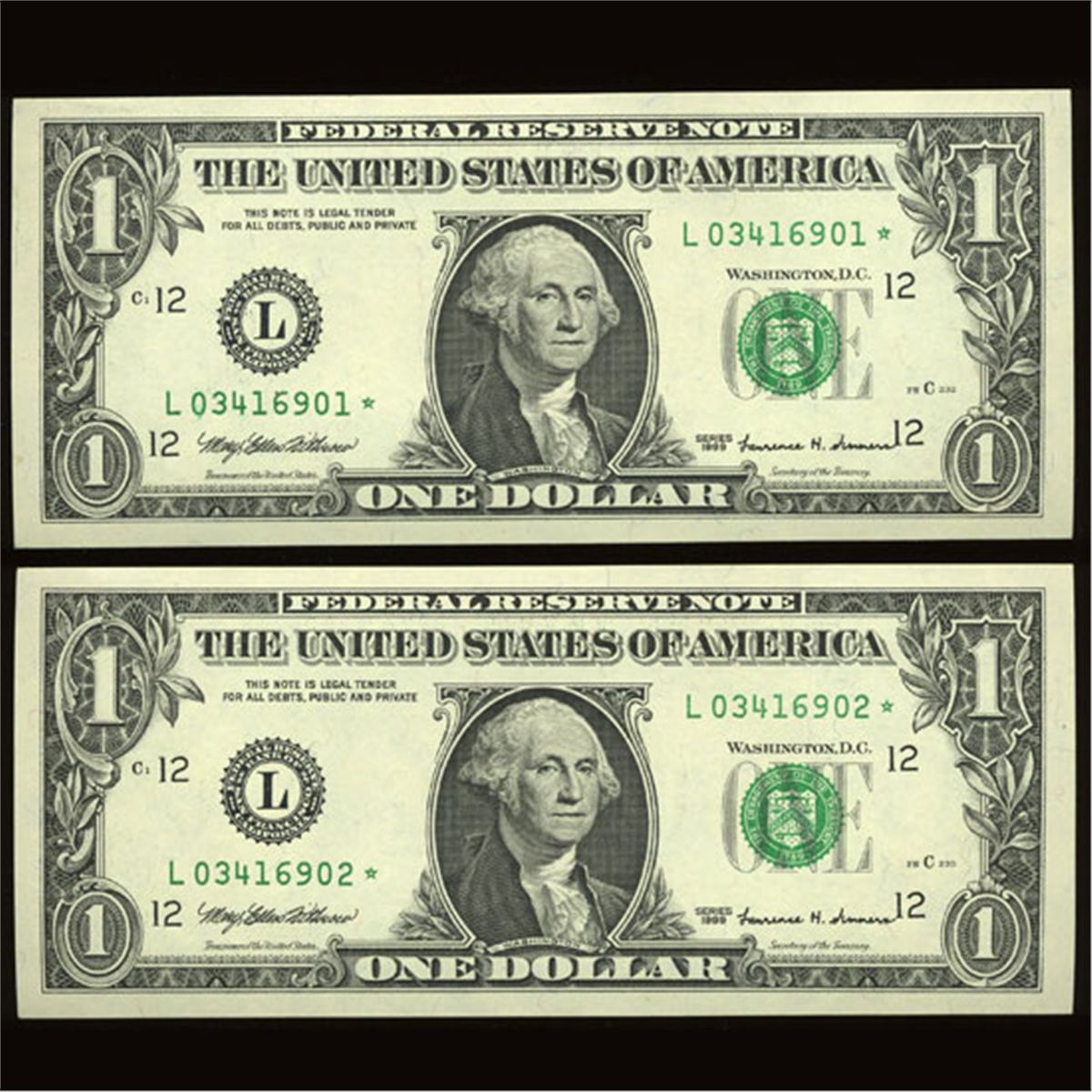 Scarce Choice/Gem uncirculated 1999 L San Francisco $1 STAR Federal Reserve Note consecutive pair