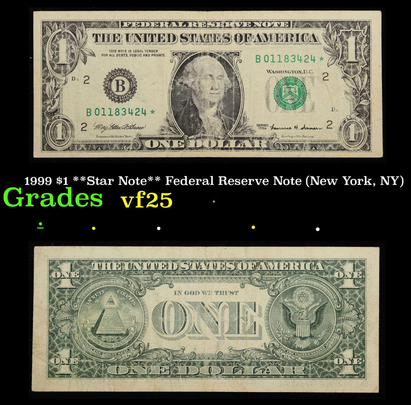 1999 $1 **Star Note** Federal Reserve Note (New York, NY) Grades vf+.