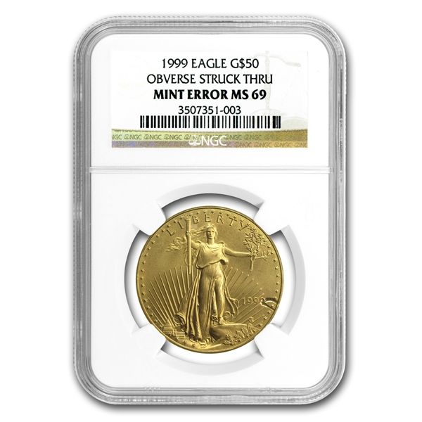 1999 1 oz Gold American Eagle MS-69 NGC Mint Error **|**|** 1999 1 oz Gold American Eagle MS-69 NGC Mint ErrorYear ***1999Grade***MS-69 Mint ErrorDenomination**50Dim.**32.7Thick:**2.87mm ; MSRP: $7400