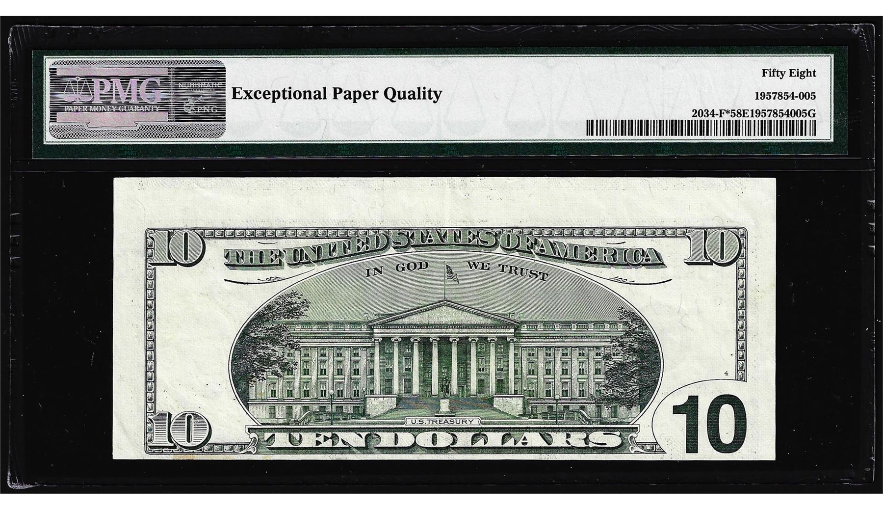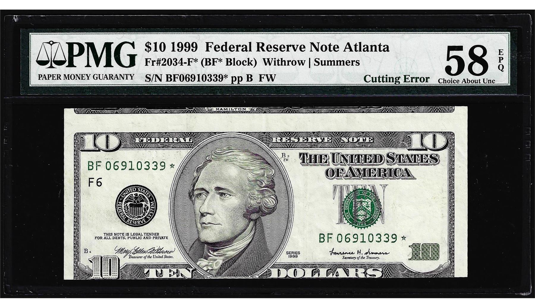1999 $10 Federal Reserve STAR Note Cutting ERROR PMG About Uncirculated 58EPQ