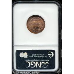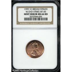 <B>1999 1C Cent--Broadstruck With Second Strike at 7 O'clock--MS66 Red NGC.</B></I> The broadstrike is very well centered with nearly even amounts of extra flan around each side. The second striking is a short arc located at 7 o'clock on the obverse, covering only 2-3% of the coin. Fully struck with full red color and pleasing surfaces. Lot:10925