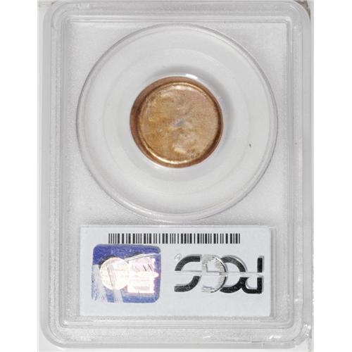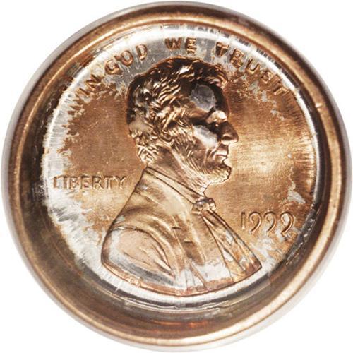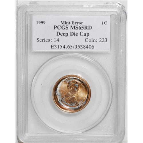 <B>1999<1C> Lincoln Cent--Deep Die Cap--MS65 Red PCGS.</B></I> A lustrous Gem with predominant bright orange color on the obverse, although dashes of powder-blue color are also present where the zinc has been struck onto the coin. The reverse displays pale gold and rose hues. A deep obverse die cap with a brockage reverse (the reverse shows a distorted, incused, and reverse portrait of Lincoln.)<BR><I>From The Troy Wiseman Collection.</B></I>