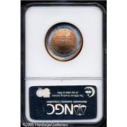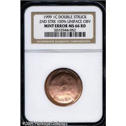 <B>1999 1C Lincoln Cent--Double Struck, Second Strike 100% Uniface Obverse--MS66 Red NGC.</B></I> Another planchet was fed into the press and on top of this piece after it was struck the first time, expanding the obverse image. Fully brilliant orange color with considerable gray zinc showing through on the reverse. Lot:10924