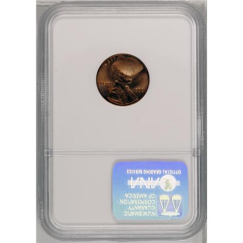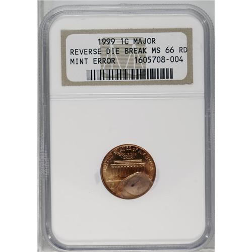 <B>1999<1C> Lincoln Cent--Reverse Die Break--MS66 Red NGC.</B></I> The reverse has a large semi-circular die break affecting about a quarter of the reverse surface at 5:00. The opposing part of the obverse has a void of similar size and shape, clearly showing the appearance of the original planchet. Otherwise, sharply struck with fully brilliant and lustrous orange surfaces.
