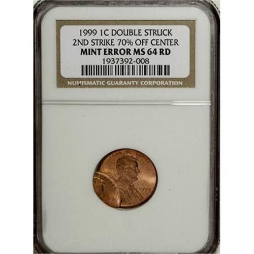 <B>1999 1C Lincoln Cent--Double Struck, 2nd Strike 70% Off Center--MS64 Red NGC.</B></I> <BR><BR><B>Coin Engraver:</B> Victor D. Brenner<BR><BR><b>Shipping:</b> Coins & Currency (<a target="_blank" href="http://www.heritageauctions.com/common/shipping.php">view shipping information</a>)