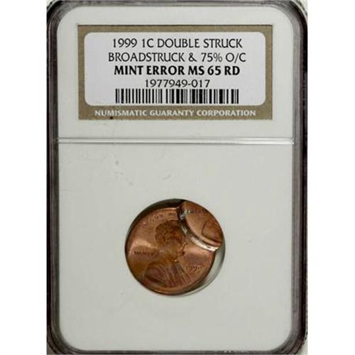 <B>1999 1C Lincoln Cent--Double Struck, Broad Struck & 75% Off Center---MS65 Red NGC.</B></I> <BR><BR><B>Coin Engraver:</B> Victor D. Brenner<BR><BR><b>Shipping:</b> Coins & Currency (<a target="_blank" href="http://www.heritageauctions.com/common/shipping.php">view shipping information</a>)