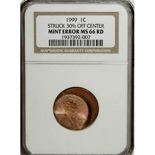 <B>1999 1C Lincoln Cent--Struck 30% Off Center--MS66 Red NGC.</B></I> <BR><BR><B>Coin Engraver:</B> Victor D. Brenner<BR><BR><b>Shipping:</b> Coins & Currency (<a target="_blank" href="http://www.heritageauctions.com/common/shipping.php">view shipping information</a>)