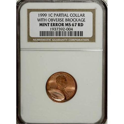 <B>1999 1C Lincoln Cent--Partial Collar with Obverse Brockage--MS67 Red NGC.</B></I> <BR><BR><B>Coin Engraver:</B> Victor D. Brenner<BR><BR><b>Shipping:</b> Coins & Currency (<a target="_blank" href="http://www.heritageauctions.com/common/shipping.php">view shipping information</a>)