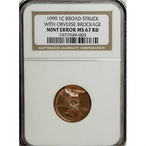 <B>1999 1C Lincoln Cent--Broad Struck with Obverse Brockage--MS67 Red NGC.</B></I> <BR><BR><B>Coin Engraver:</B> Victor D. Brenner<BR><BR><b>Shipping:</b> Coins & Currency (<a target="_blank" href="http://www.heritageauctions.com/common/shipping.php">view shipping information</a>)