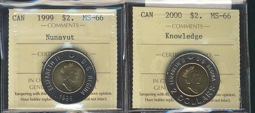 1999 $2 Nunavut & 2000 Knowledge ICCS MS66. Lot of 2 coins.