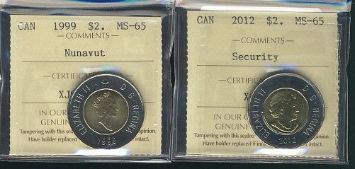 1999 $2 Nunavut & 2012 Security ICCS MS65. Lot of 2 coins.