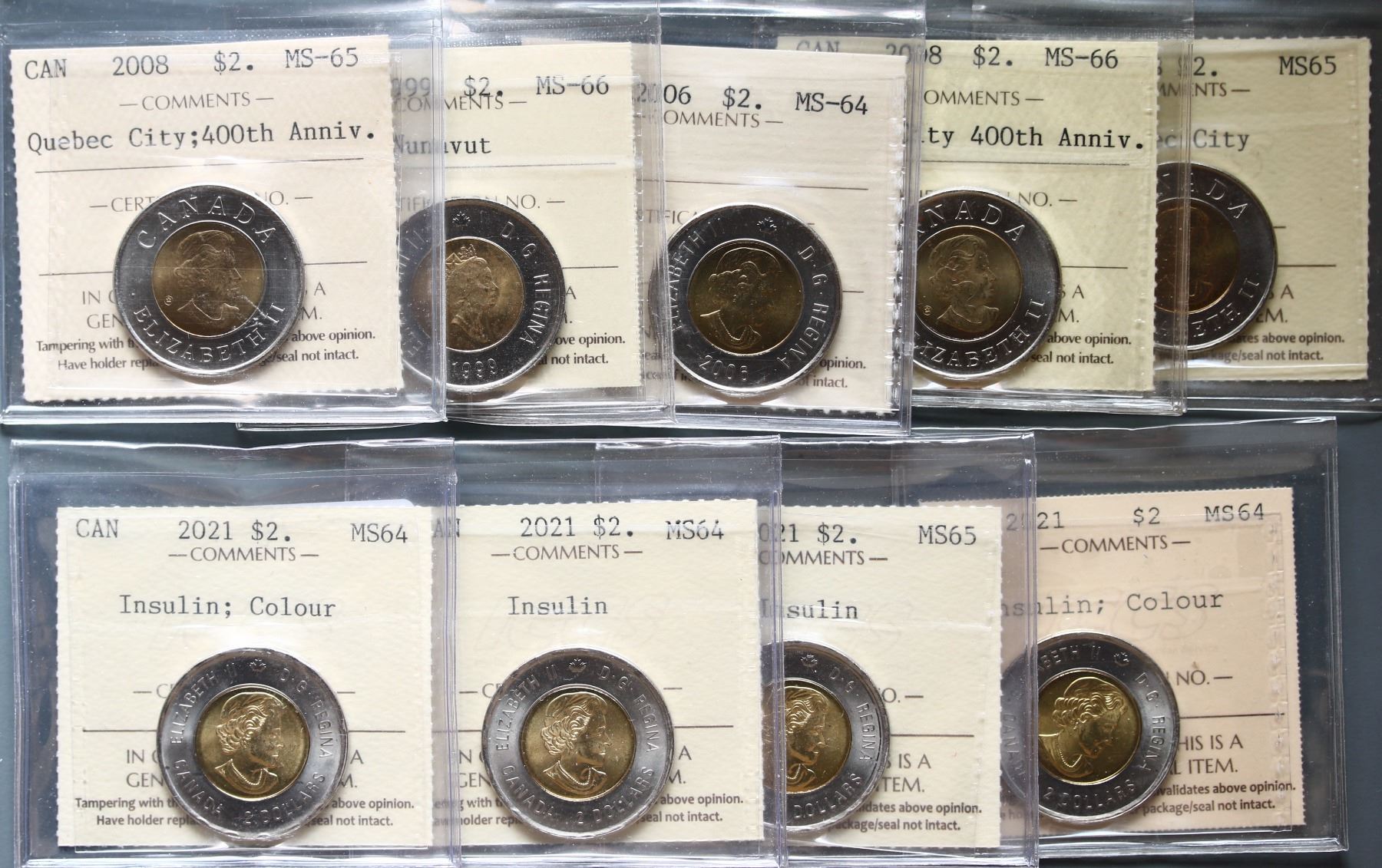 1999 $2 to 2021 Lot of 9 coins all Graded ICCS Choice Mint State-64 to Superb Gem Mint State-66. See Pic.
