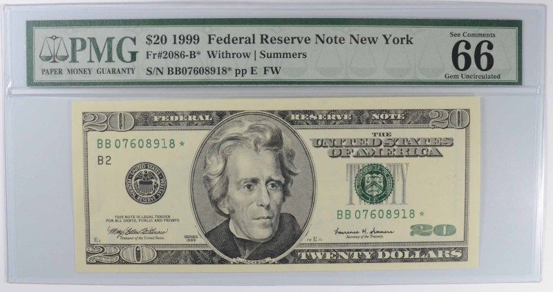 1999 $20 FEDERAL RESERVE (STAR) NOTE (NEW YORK, NY) PMG 66