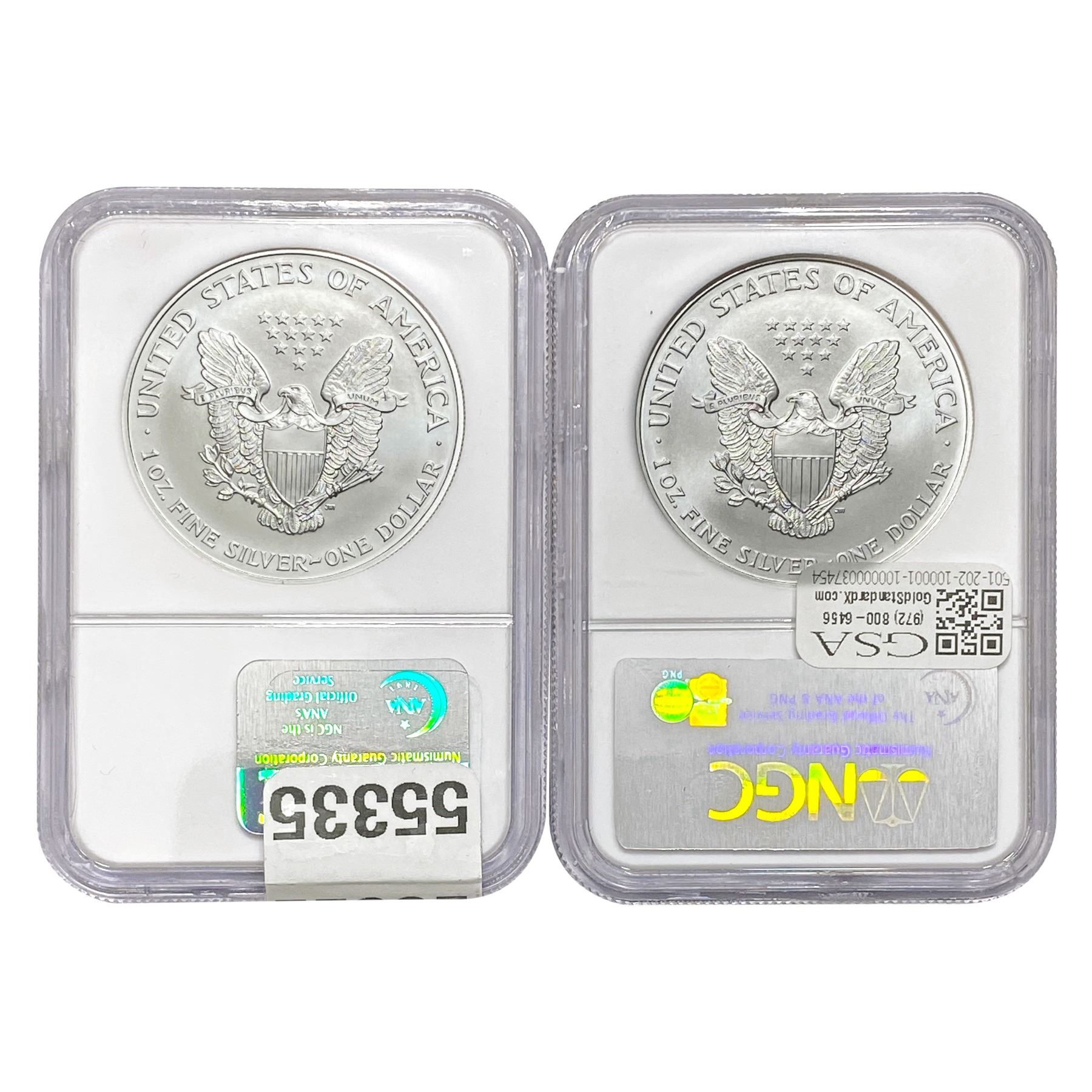 e. Coins sold referencing a third-party grading service are sold “AS IS” without any express or implied warranty, except for a guarantee by GSA that they are genuine. Removal or alteration of the holder, voids all of Bidder’s claims concerning that Product. Certain warranties may be available from the grading services and Bidders are referred to them for further details: Numismatic Guaranty Corporation (NGC), PO Box 4776, Sarasota, FL 34230, www.ngccoin.com/services/writtenguarantee.asp; Professional Coin Grading Services (PCGS), PO Box 9458, Newport Beach, CA 92658, www.pcgs.com/guarantee.html; ANACS, 6555 S. Kenton St., Ste. 303, Englewood, CO 80111; and Independent Coin Grading Co. (ICG), 7901 East Bellview, Ave., Suite 50, Englewood, CO 80111.