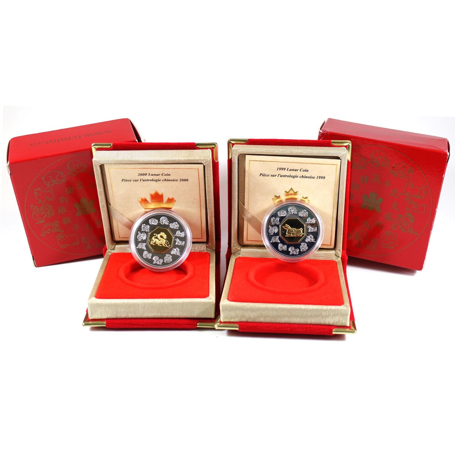 1999 & 2000 Canada $15 Lunar Sterling Silver and Gold Plated Cameo Coins: 1999 Year of the Rabbit, & 2000 Year of the Dragon. Comes with original Mint packaging (outer packaging is impaired, 1999 contains a scuff mark). 2pcs