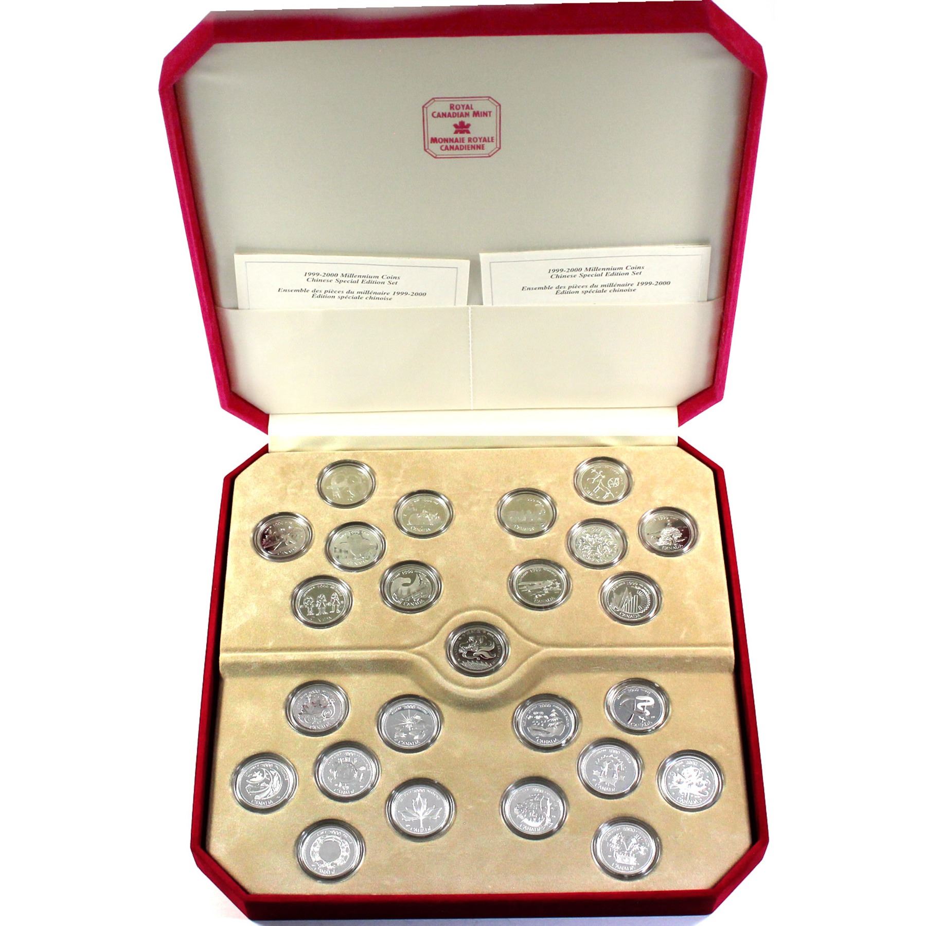 1999-2000 Canada Special Edition Chinese Millennium Sterling Silver Commemorative 25-coin Set in Deluxe Red Felt Display Case. This set features complete 12-coin 1999 & 2000 25-cent millennium coins with commemorative sterling silver token (outer sleeve lightly worn).