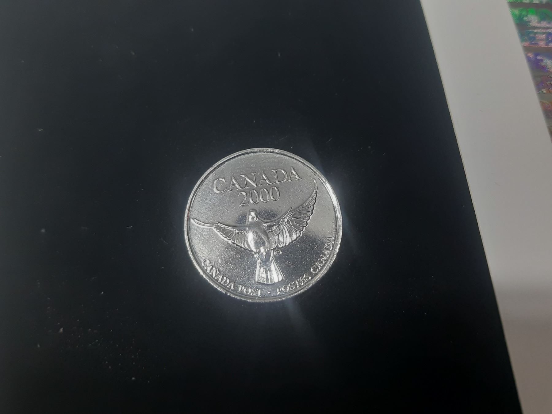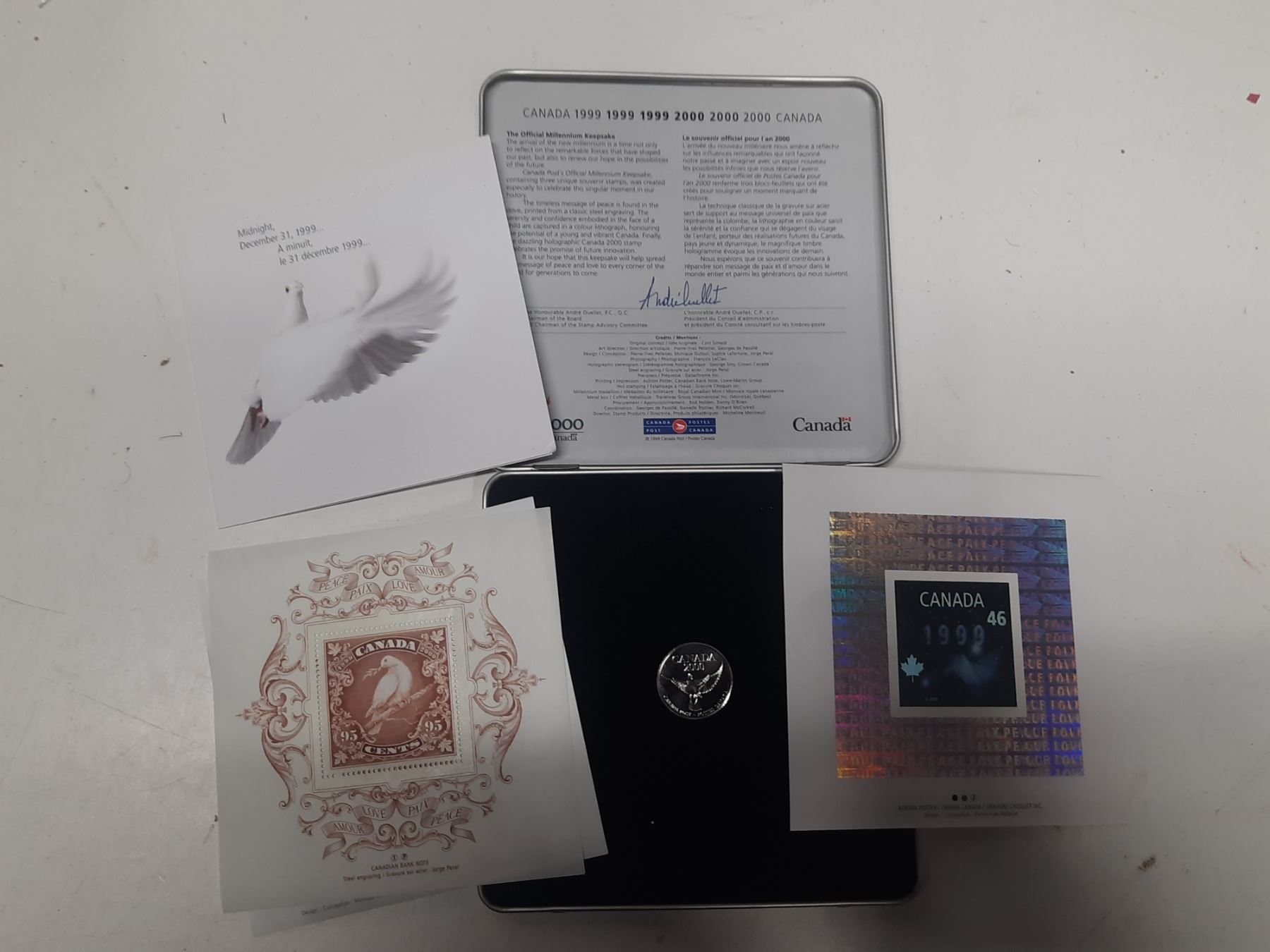 1999 – 2000 Official Millennium Keepsake set. Consists of 3 Stamps and a Canada Post Dove medal. Housed in its original case of issue.