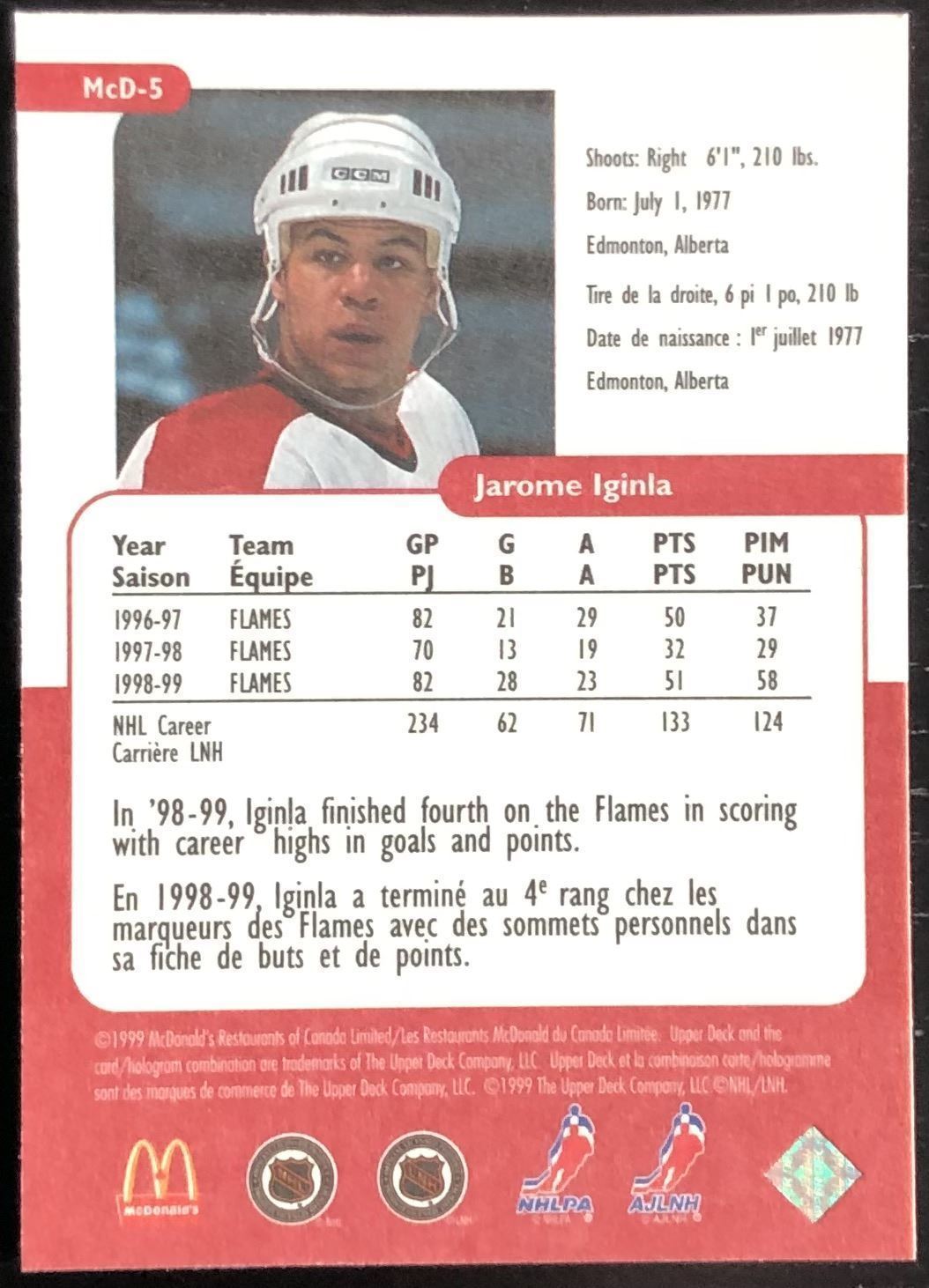 McDonald's card #5 NHL, hockey, UD, hall of fame, regional