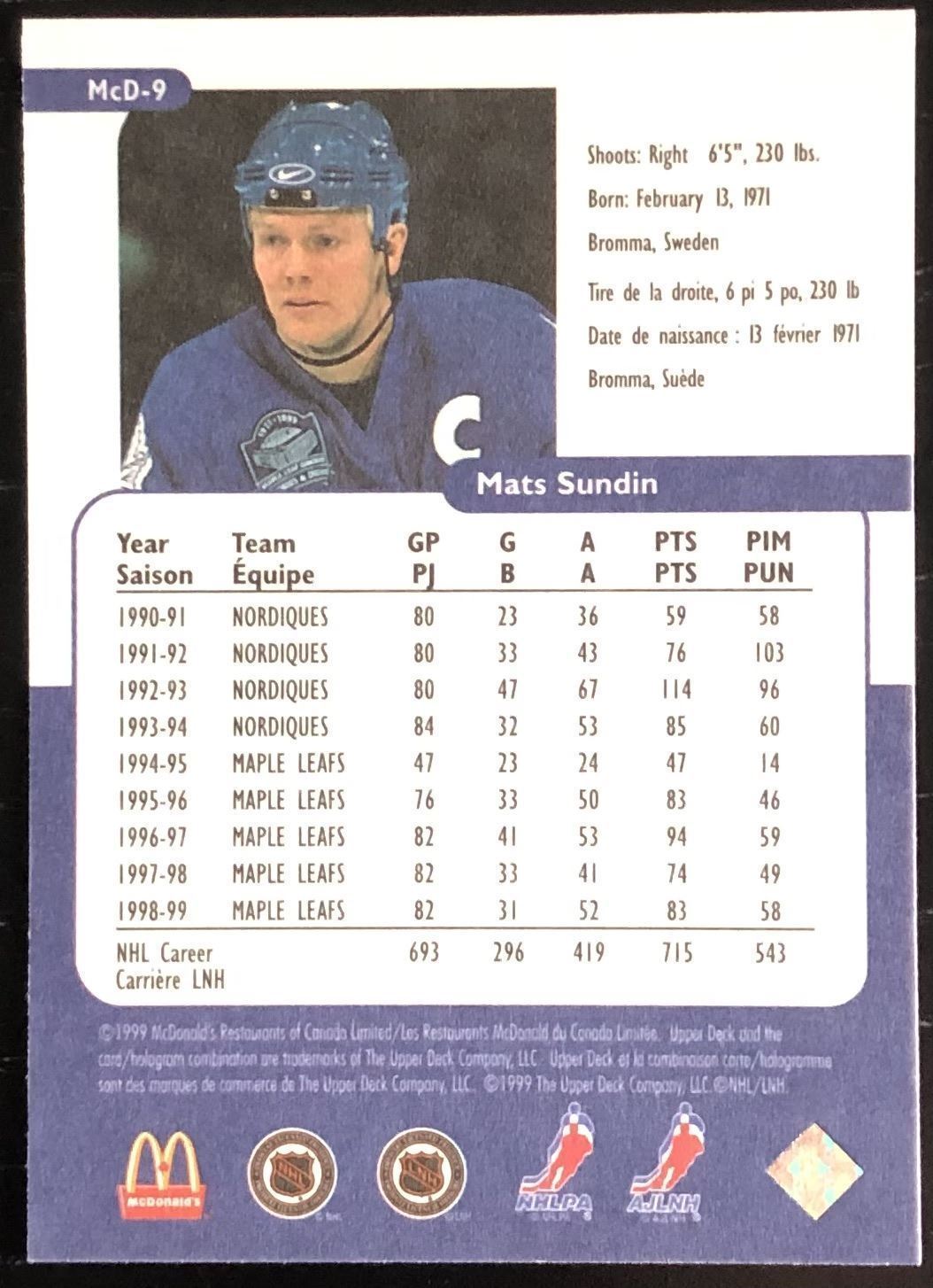 McDonald's card #9 NHL, hockey, hall of fame, regional