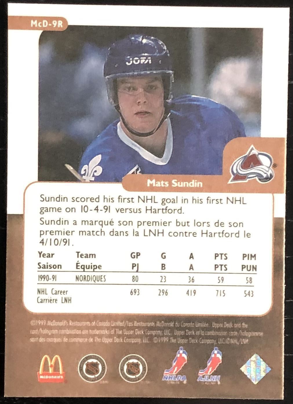McDonald's card #9R NHL, hockey, hall of fame, regional