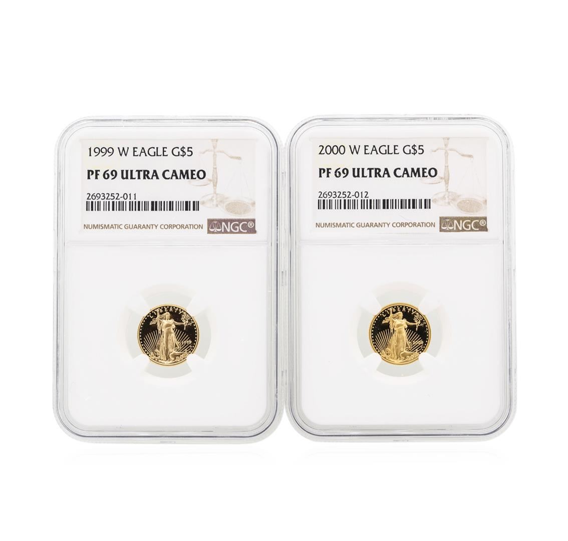1999-2000-W NGC PF69 Ultra Cameo $5 Eagle Gold Coin Set. The set features: 1999-W NGC PF69 Ultra Cameo $5 Eagle Gold Coin and 2000-W NGC PF69 Ultra Cameo $5 Eagle Gold Coin.