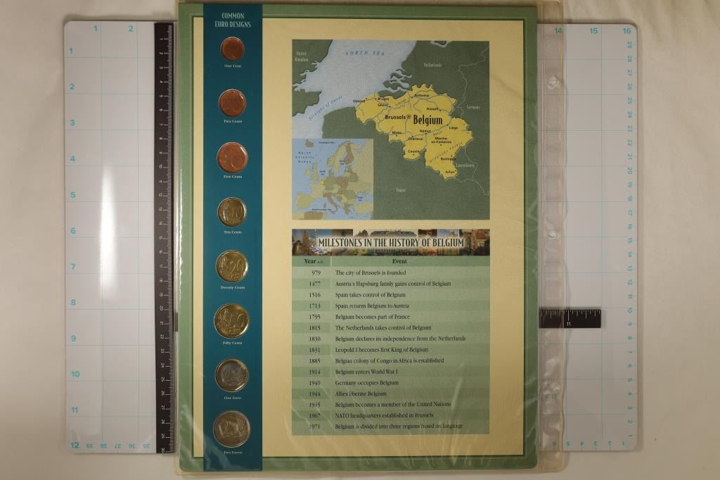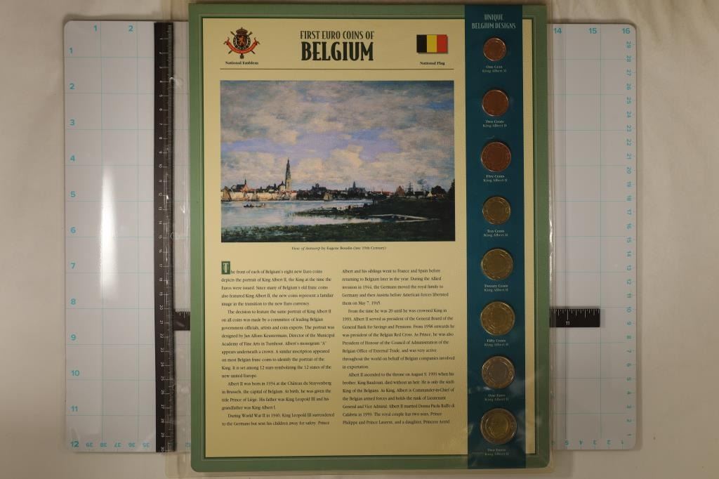 LARGE INFO CARD IN PLASTIC SLEEVE, 1ST EURO COINS OF BELGIUM