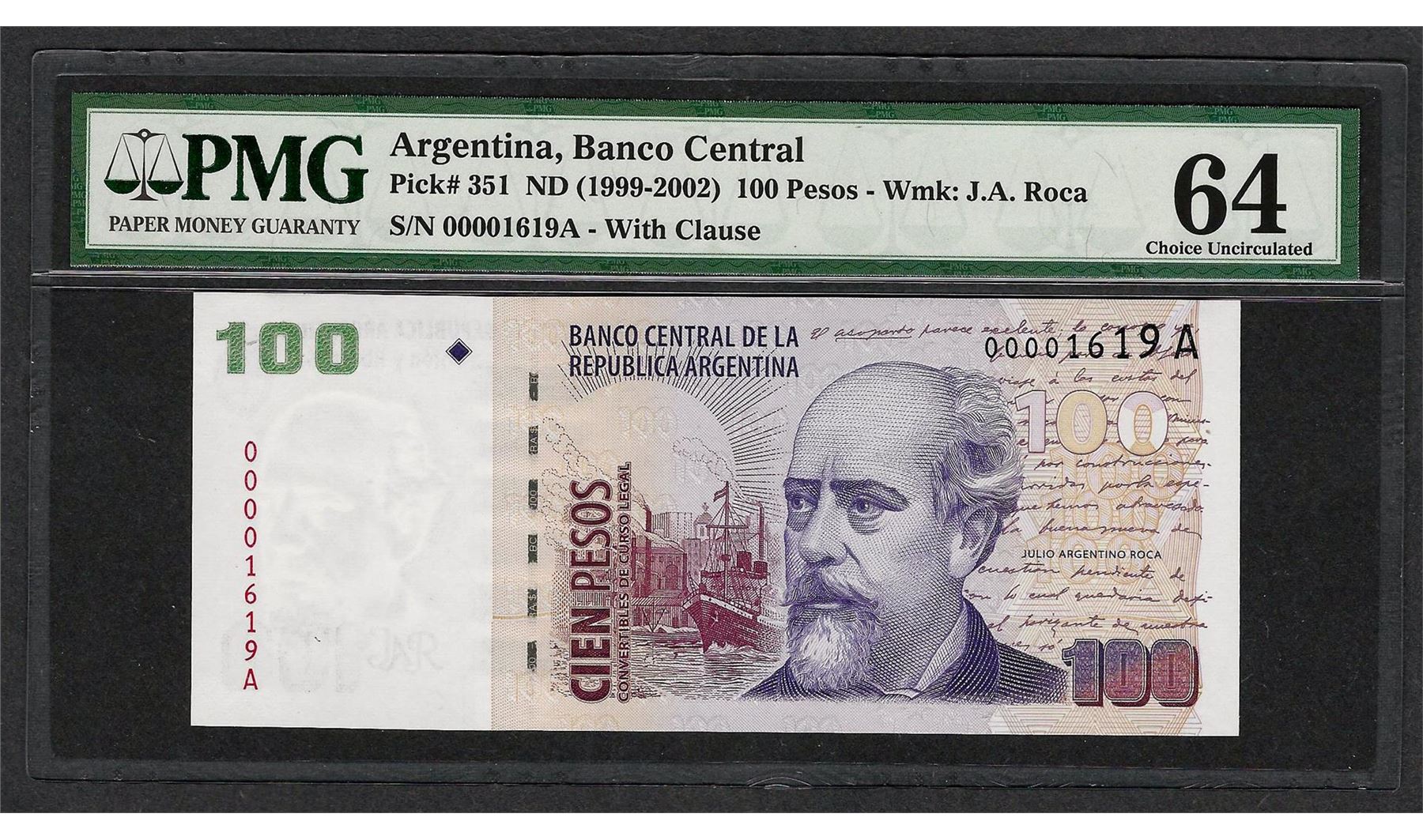 One 1999-2002 Banco Central Argentina 100 Pesos Note Pick# 351 PMG Choice Uncirculated 64. PMG Certified.